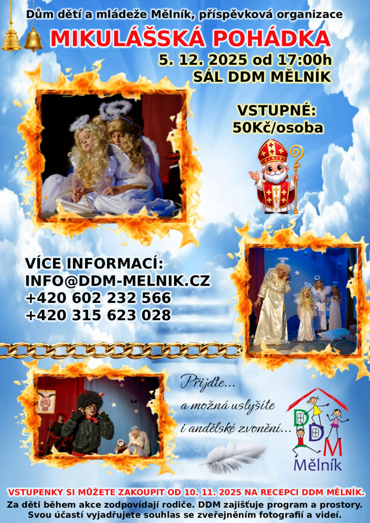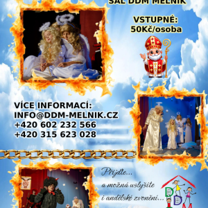 05.12.2025 Pohádka trochu andělská a trochu čertovská v podání kolektivu DDM Mělník a dětí ze ZÚ. Jednodenní akce pro děti z mělnických MŠ v dopoledních hodinách a pro veřejnost v odpoledních hodinách spojená s tradiční mikulášskou nadílkou v Domečku. Jakékoli dotazy k této akci prosím směřujte na r...